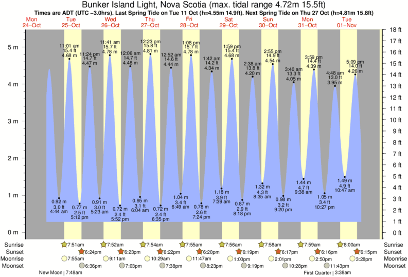 Tide Times are AST (UTC -4.0hrs). Last Spring High Tide at Bunker Island Light was on Sat 06 Dec (height: 4.96m 16.3ft). Next high Spring Tide at Bunker Island Light will be on Tue 23 Dec (height: 4.39m 14.4ft).