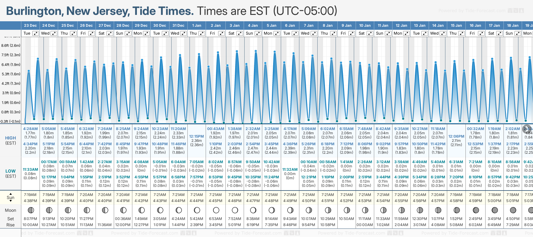 Tide Times are EST (UTC -5.0hrs). Last Spring High Tide at Burlington was on Fri 19 Dec (height: 2.22m 7.3ft). Next high Spring Tide at Burlington will be on Sun 04 Jan (height: 2.47m 8.1ft).