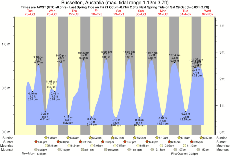Tide Times are AWST (UTC +8.0hrs). Last Spring High Tide at Busselton was on Sat 06 Dec (height: 0.98m 3.2ft). Next high Spring Tide at Busselton will be on Sat 03 Jan (height: 1.04m 3.4ft).
