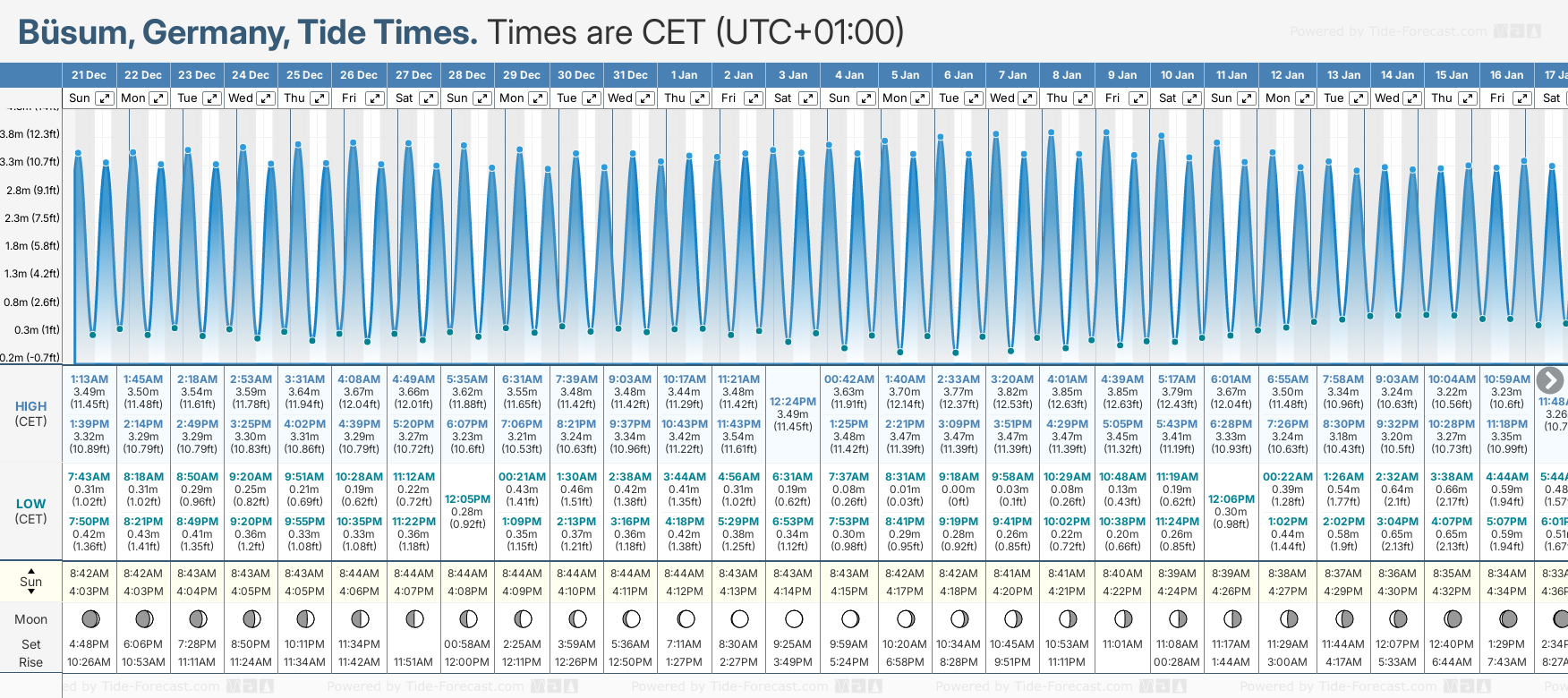 Tide Times are CET (UTC +1.0hrs). Last Spring High Tide at Busum was on Fri 19 Dec (height: 3.49m 11.5ft). Next high Spring Tide at Busum will be on Fri 26 Dec (height: 3.67m 12.0ft).