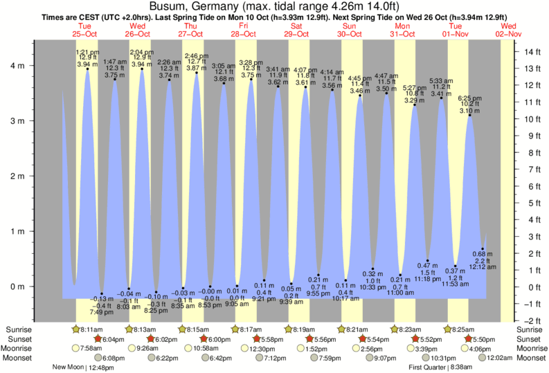 December and January Tide charts for Busum: The tide charts below show the height, time and date of high and low tides for the next 30 days.