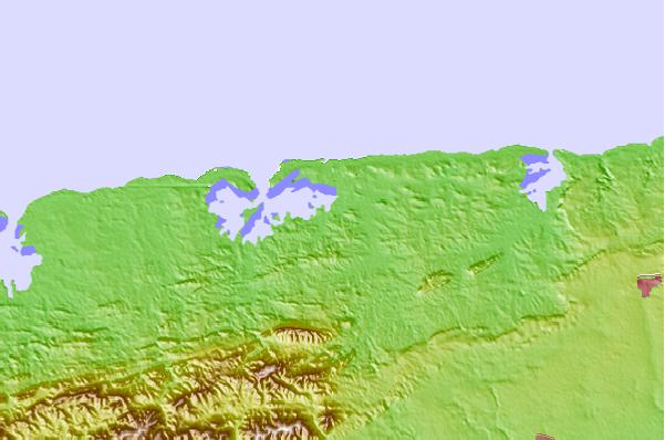 Use this relief map to navigate to tide stations, surf breaks and cities that are in the area of Cabanas.