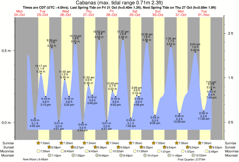 Tide Times are CST (UTC -5.0hrs). Last Spring High Tide at Cabanas was on Sat 20 Dec (height: 0.56m 1.8ft). Next high Spring Tide at Cabanas will be on Fri 02 Jan (height: 0.65m 2.1ft).