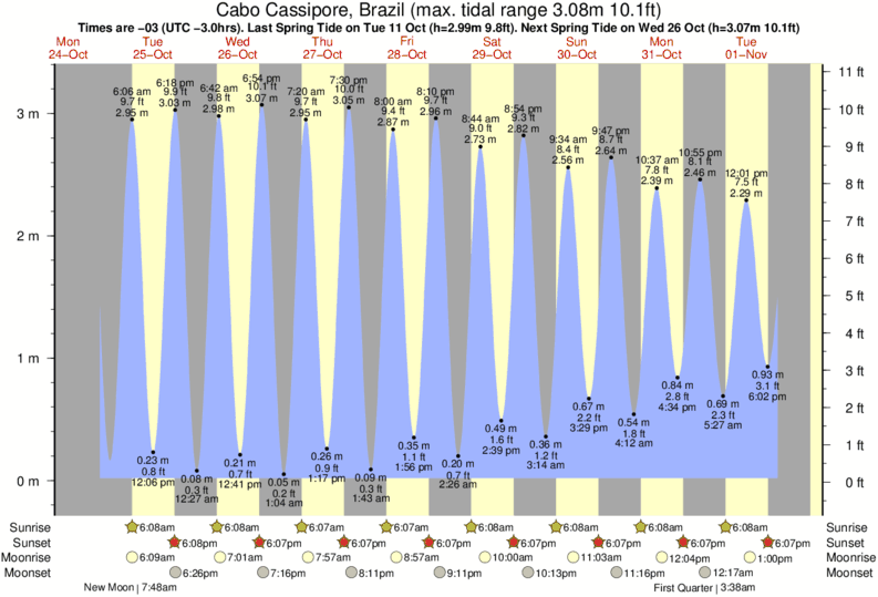 Tide Times are -03 (UTC -3.0hrs). Last Spring High Tide at Cabo Cassipore was on Fri 05 Dec (height: 3.02m 9.9ft). Next high Spring Tide at Cabo Cassipore will be on Sun 21 Dec (height: 2.75m 9.0ft).