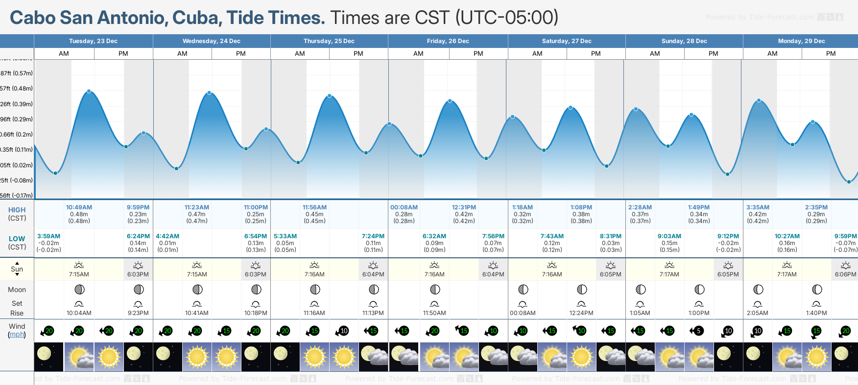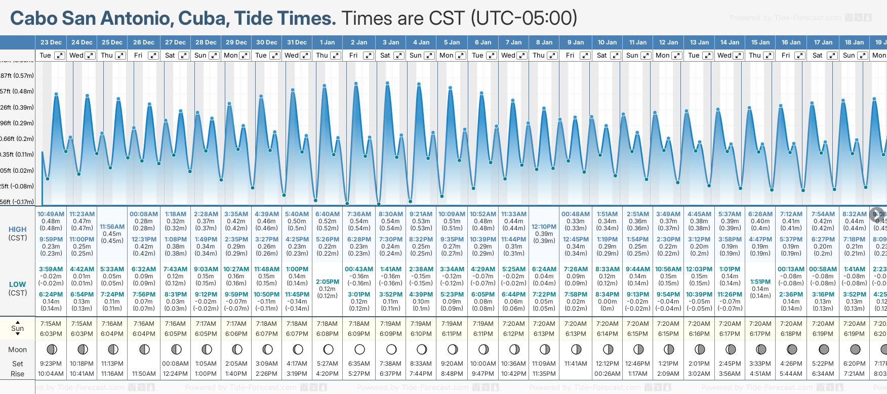 Tide Times are CST (UTC -5.0hrs). Last Spring High Tide at Cabo San Antonio was on Tue 23 Dec (height: 0.48m 1.6ft). Next high Spring Tide at Cabo San Antonio will be on Fri 02 Jan (height: 0.54m 1.8ft).