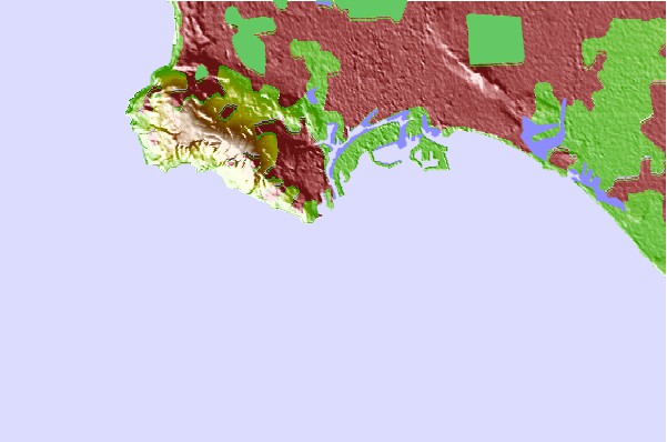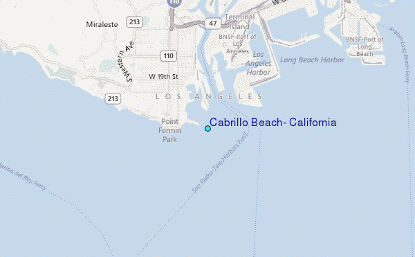 Use this relief map to navigate to tide stations, surf breaks and cities that are in the area of Cabrillo Beach, California.
