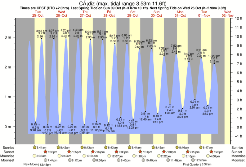 Tide Times are CET (UTC +1.0hrs). Last Spring High Tide at Cádiz was on Sat 06 Dec (height: 3.07m 10.1ft). Next high Spring Tide at Cádiz will be on Mon 22 Dec (height: 2.70m 8.9ft).