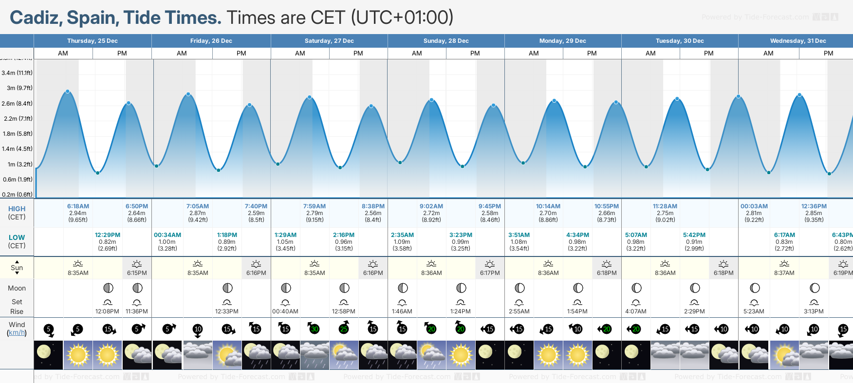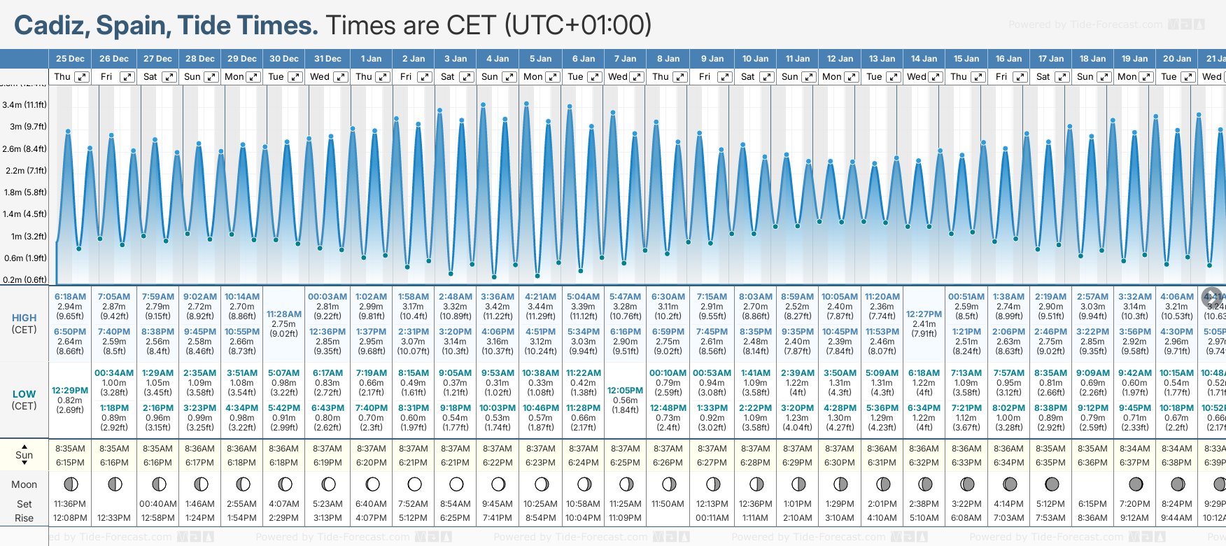 December and January Tide charts for Cadiz: The tide charts below show the height, time and date of high and low tides for the next 30 days.