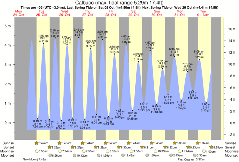 Tide Times are -04 (UTC -3.0hrs). Last Spring High Tide at Calbuco was on Thu 18 Dec (height: 3.80m 12.5ft). Next high Spring Tide at Calbuco will be on Sat 03 Jan (height: 4.65m 15.3ft).