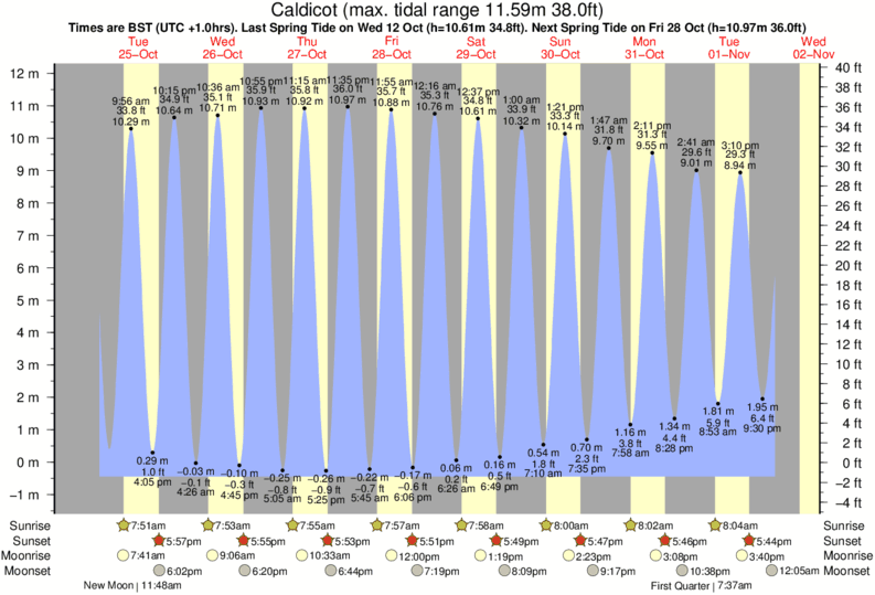 Tide Times are GMT (UTC +0hrs). Last Spring High Tide at Caldicot was on Sat 06 Dec (height: 10.96m 36.0ft). Next high Spring Tide at Caldicot will be on Wed 24 Dec (height: 10.16m 33.3ft).