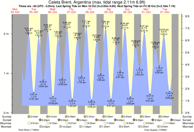 Caleta Brent tide chart key: The tide chart above shows the height and times of high tide and low tide for Caleta Brent, Argentina. The grey shading corresponds to nighttime hours between sunset and sunrise at Caleta Brent.