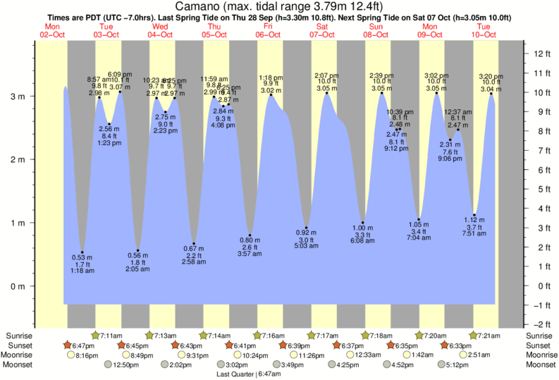 Tide Times are PST (UTC -8.0hrs). Last Spring High Tide at Camano was on Fri 05 Dec (height: 3.54m 11.6ft). Next high Spring Tide at Camano will be on Mon 22 Dec (height: 3.28m 10.8ft).