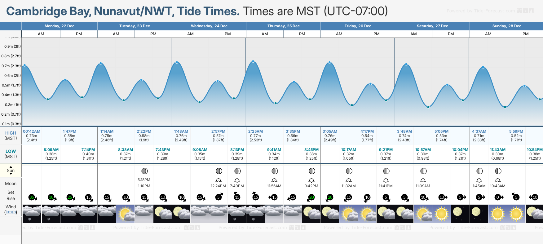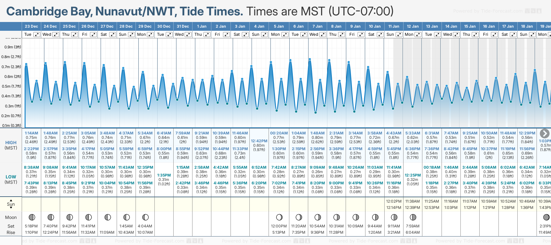 December and January Tide charts for Cambridge Bay: The tide charts below show the height, time and date of high and low tides for the next 30 days.