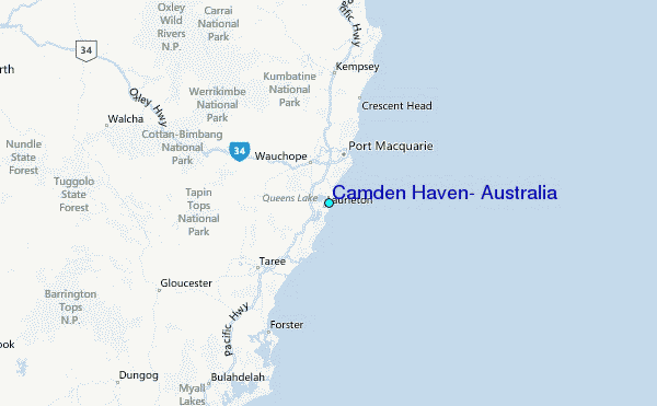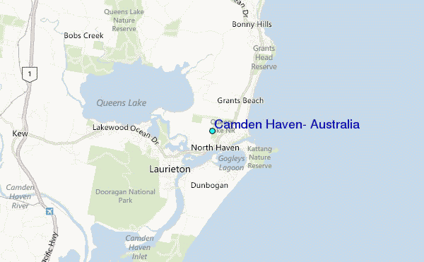 Use this relief map to navigate to tide stations, surf breaks and cities that are in the area of Camden Haven, Australia.