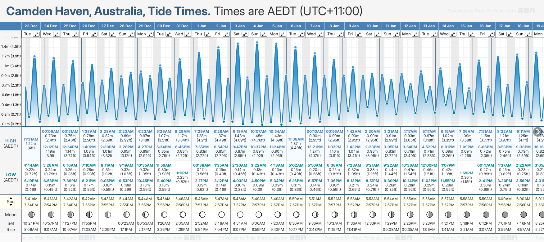 Tide Times are AEDT (UTC +11.0hrs). Last Spring High Tide at Camden Haven was on Sun 21 Dec (height: 1.24m 4.1ft). Next high Spring Tide at Camden Haven will be on Sun 04 Jan (height: 1.45m 4.8ft).