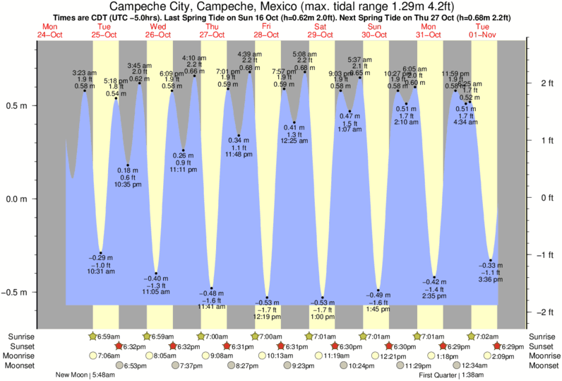 Tide Times are CST (UTC -6.0hrs). Last Spring High Tide at Campeche City was on Thu 18 Dec (height: 0.65m 2.1ft). Next high Spring Tide at Campeche City will be on Fri 02 Jan (height: 0.73m 2.4ft).