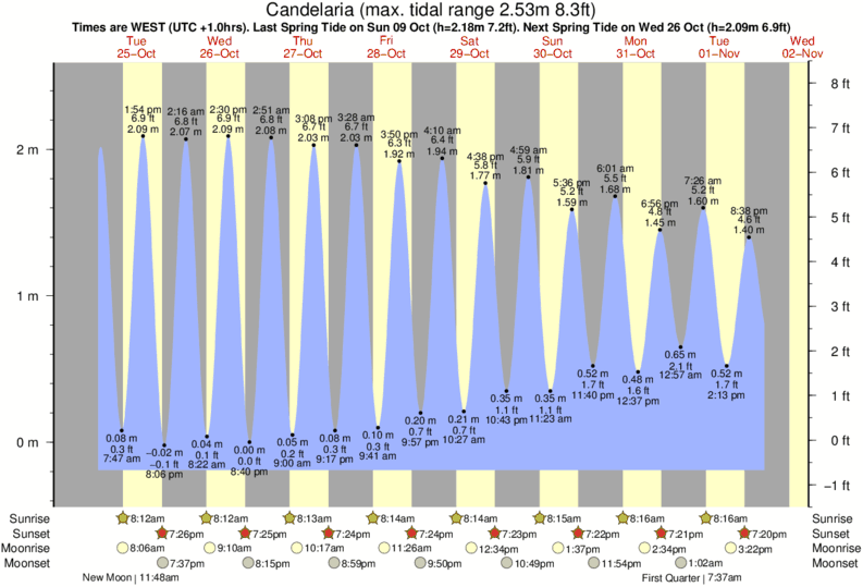 Tide Times are WET (UTC +0hrs). Last Spring High Tide at Candelaria was on Sat 06 Dec (height: 2.15m 7.1ft). Next high Spring Tide at Candelaria will be on Mon 05 Jan (height: 2.19m 7.2ft).