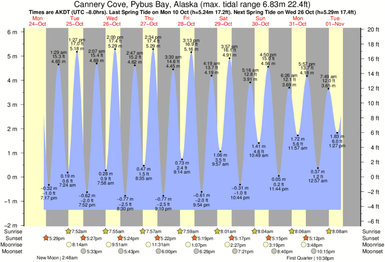 Tide chart for Cannery Cove, Pybus BayShowing low and high tide times for the next 30 days at Cannery Cove, Pybus Bay. Tide Times are AKST (UTC -9.0hrs).