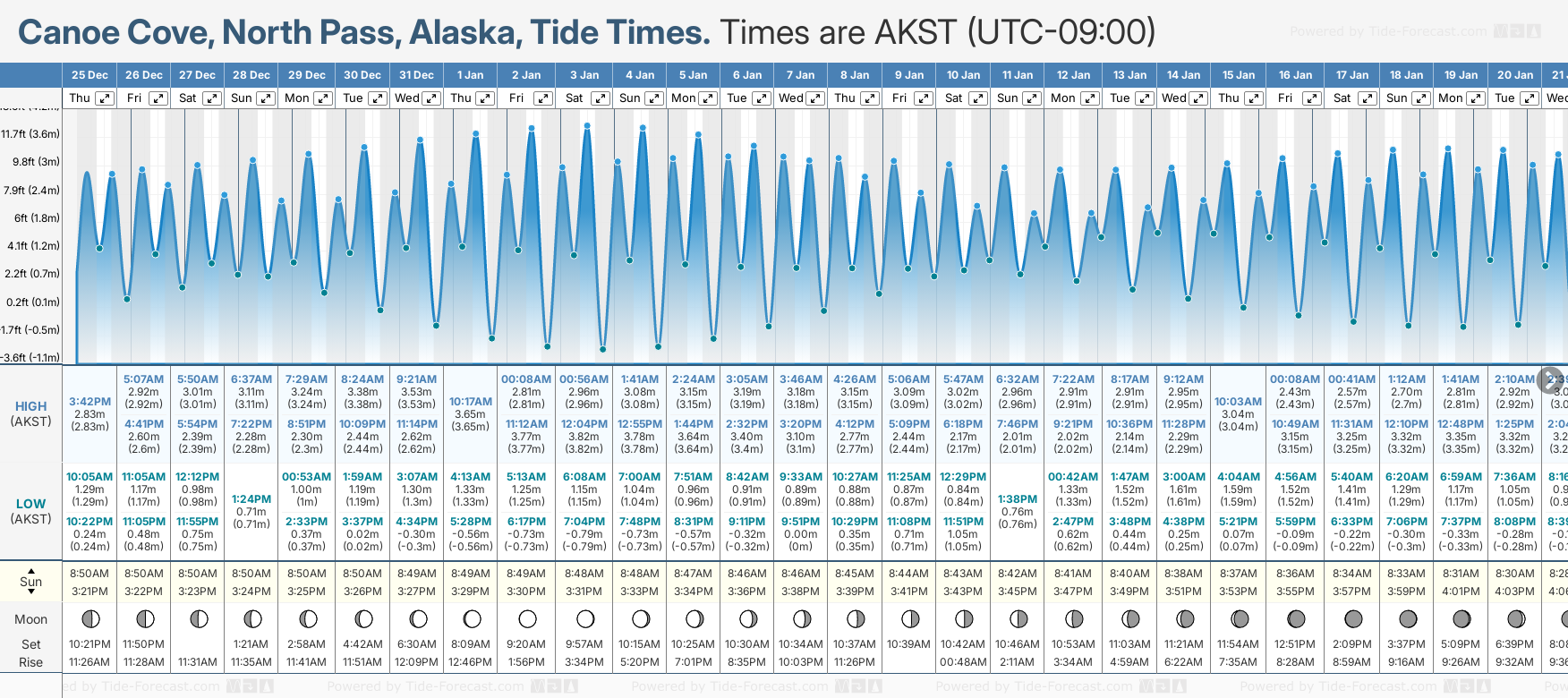Tide Times are AKST (UTC -9.0hrs). Last Spring High Tide at Canoe Cove, North Pass was on Sat 20 Dec (height: 3.35m 11.0ft). Next high Spring Tide at Canoe Cove, North Pass will be on Sat 03 Jan (height: 3.82m 12.5ft).