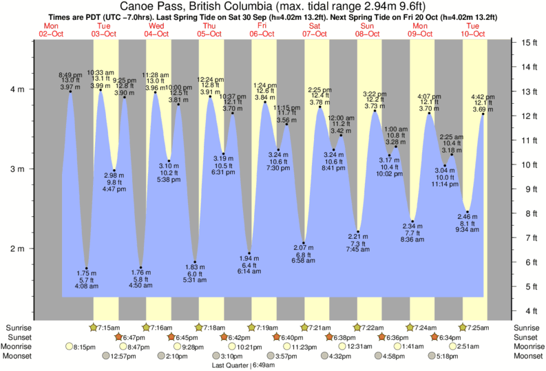 Tide Times are PST (UTC -8.0hrs). Last Spring High Tide at Canoe Pass was on Sun 07 Dec (height: 4.34m 14.2ft). Next high Spring Tide at Canoe Pass will be on Fri 26 Dec (height: 4.20m 13.8ft).