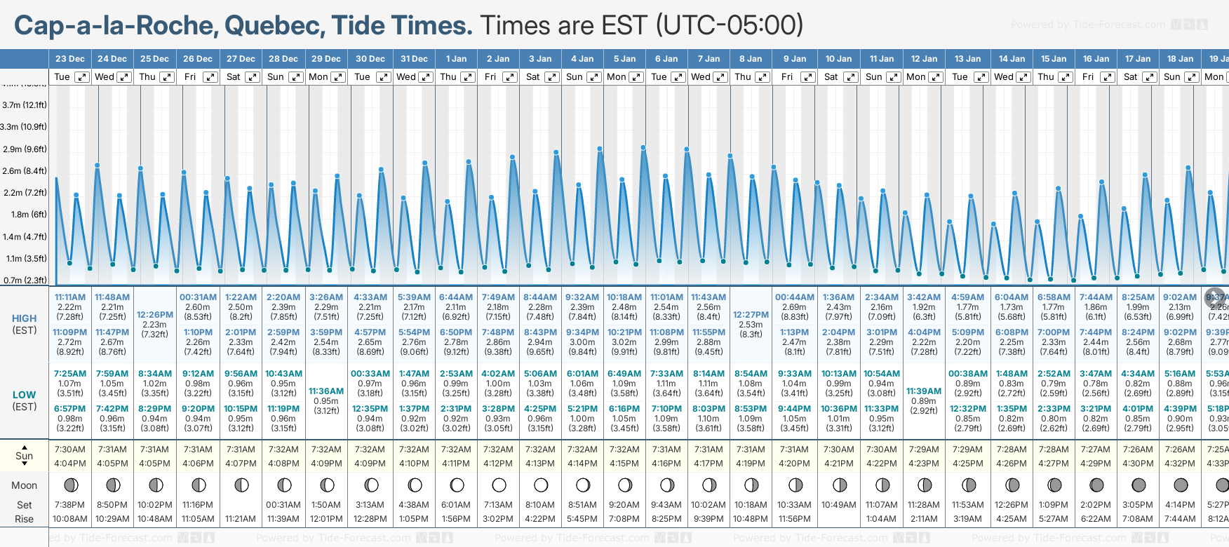Tide Times are EST (UTC -5.0hrs). Last Spring High Tide at Cap-a-la-Roche was on Fri 05 Dec (height: 3.18m 10.4ft). Next high Spring Tide at Cap-a-la-Roche will be on Mon 05 Jan (height: 3.02m 9.9ft).