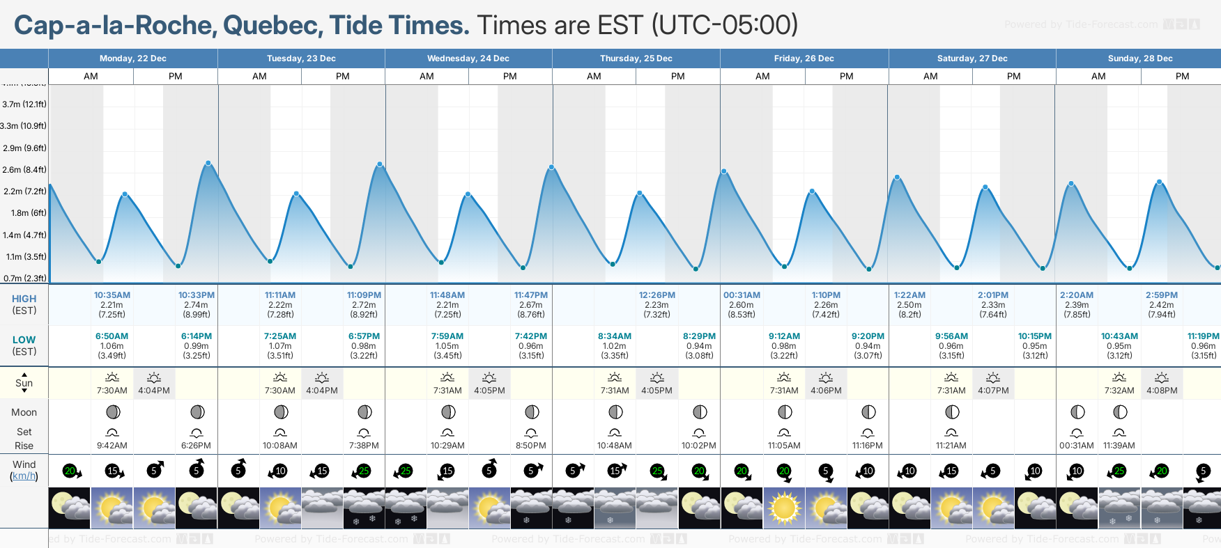 December and January Tide charts for Cap-a-la-Roche: The tide charts below show the height, time and date of high and low tides for the next 30 days.