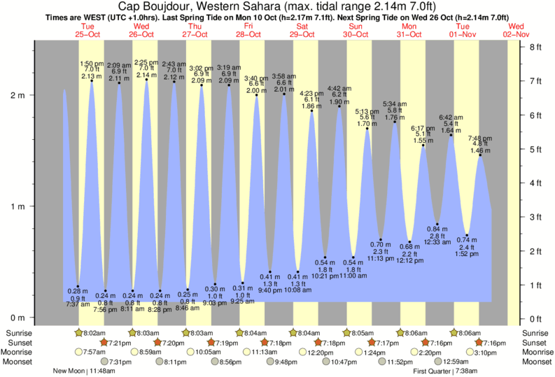 Tide Times are +01 (UTC +1.0hrs). Last Spring High Tide at Cap Boujdour was on Sat 06 Dec (height: 2.14m 7.0ft). Next high Spring Tide at Cap Boujdour will be on Mon 22 Dec (height: 1.98m 6.5ft).
