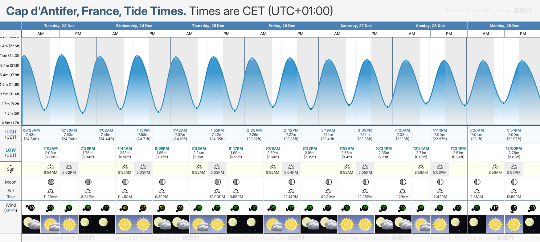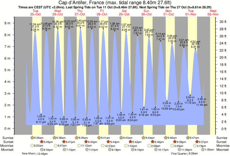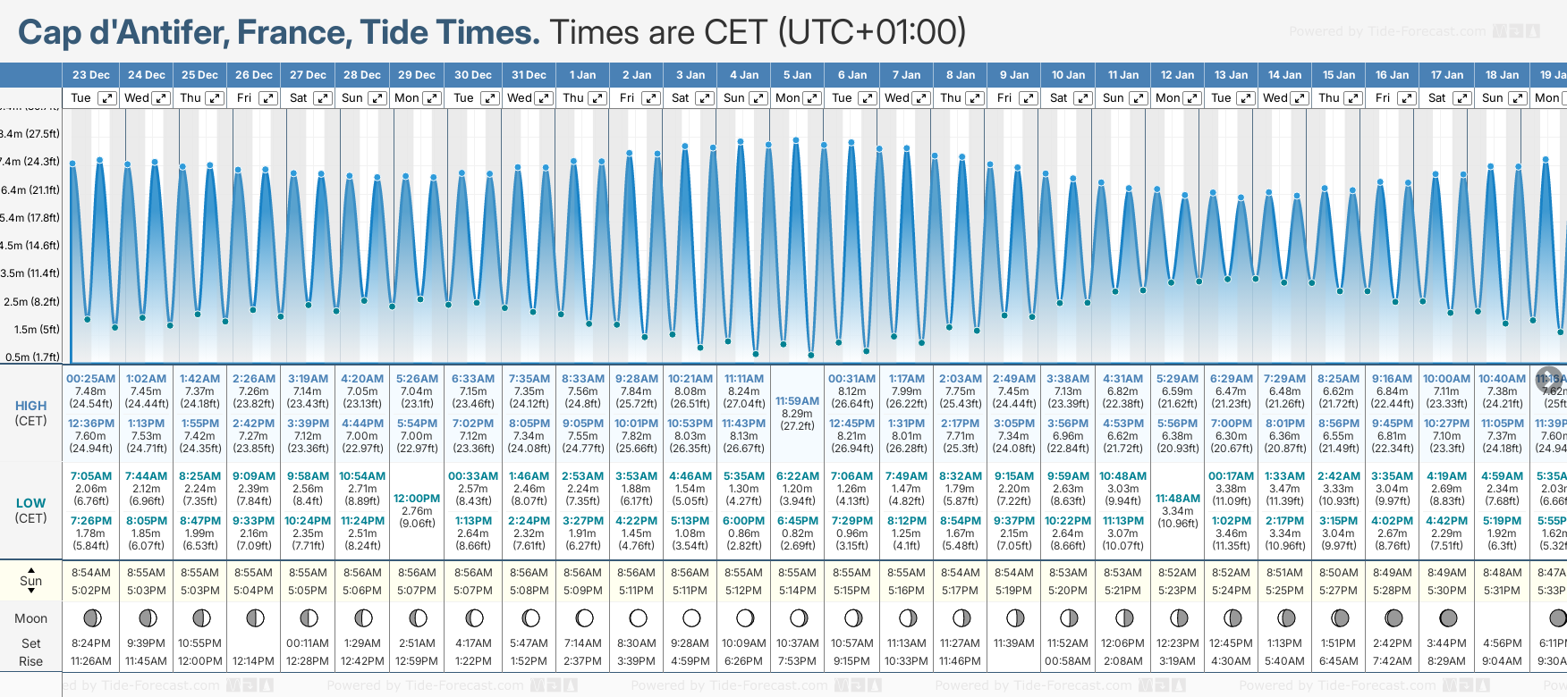 December and January Tide charts for Cap d'Antifer: The tide charts below show the height, time and date of high and low tides for the next 30 days.