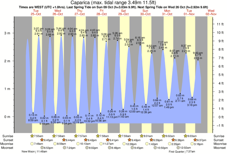 Tide Times are WET (UTC +0hrs). Last Spring High Tide at Caparica was on Sat 06 Dec (height: 3.03m 9.9ft). Next high Spring Tide at Caparica will be on Mon 22 Dec (height: 2.66m 8.7ft).