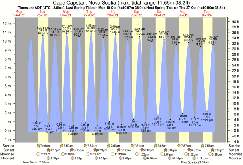 Tide chart for Cape CapstanShowing low and high tide times for the next 30 days at Cape Capstan. Tide Times are AST (UTC -4.0hrs).