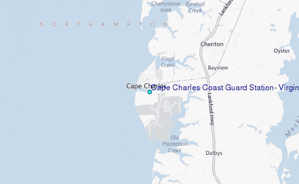 Use this relief map to navigate to tide stations, surf breaks and cities that are in the area of Cape Charles Coast Guard Station, Virginia.