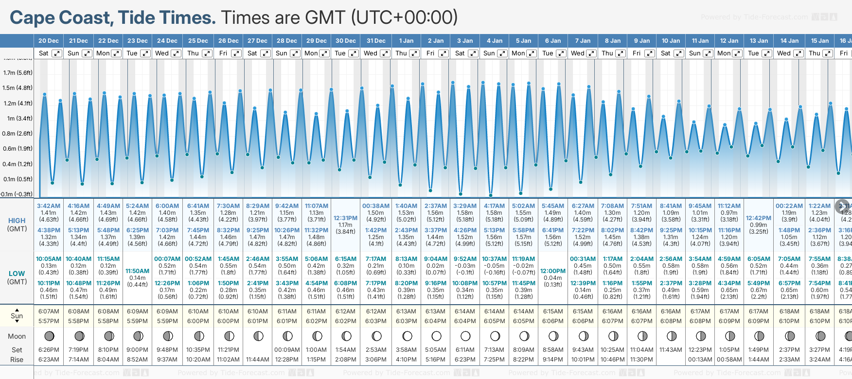 December and January Tide charts for Cape Coast: The tide charts below show the height, time and date of high and low tides for the next 30 days.