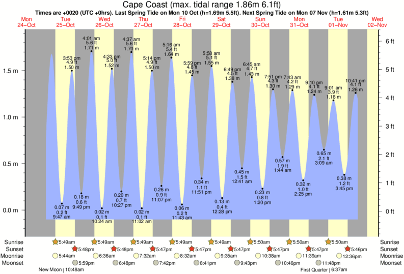 Tide Times are GMT (UTC +0hrs). Last Spring High Tide at Cape Coast was on Thu 04 Dec (height: 1.69m 5.5ft). Next high Spring Tide at Cape Coast will be on Mon 22 Dec (height: 1.43m 4.7ft).