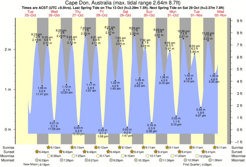 Cape Don tide chart key: The tide chart above shows the height and times of high tide and low tide for Cape Don, Australia. The grey shading corresponds to nighttime hours between sunset and sunrise at Cape Don.
