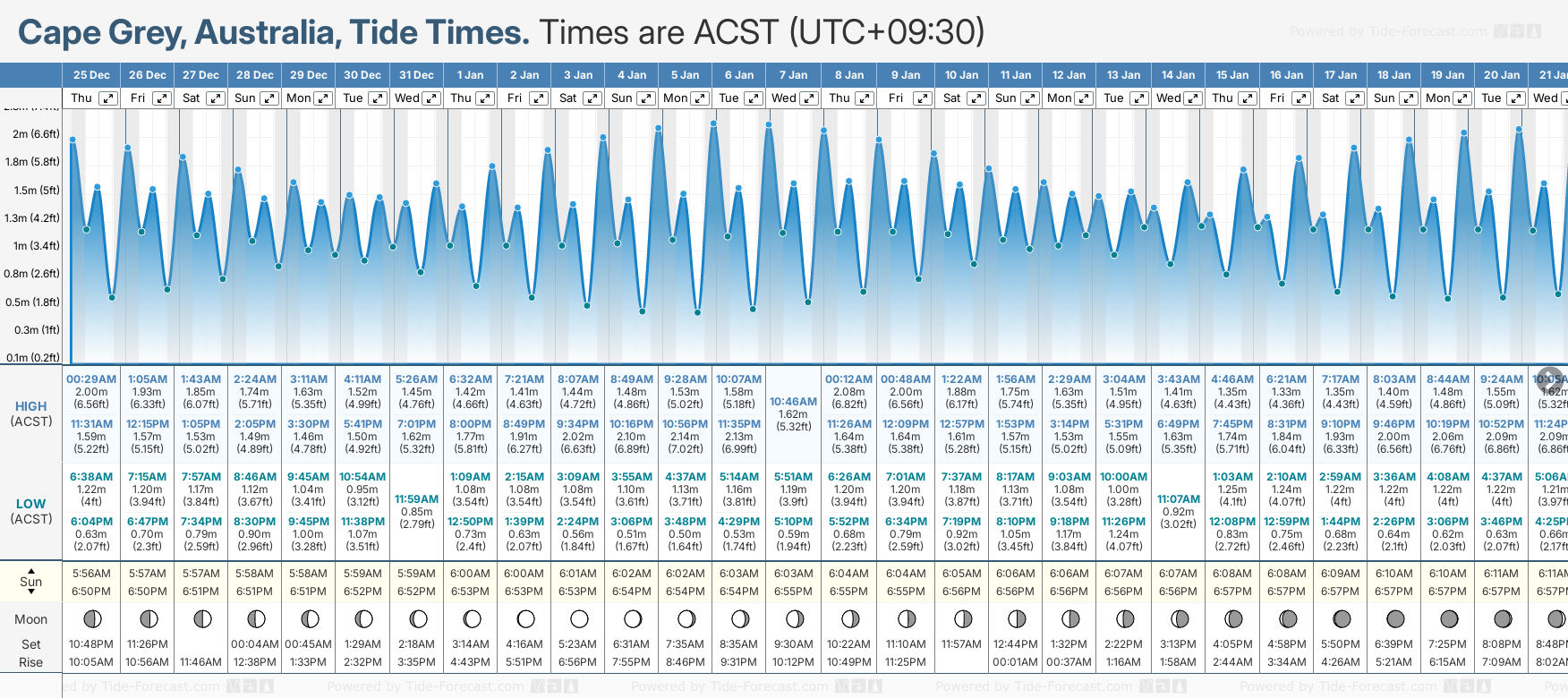 December and January Tide charts for Cape Grey: The tide charts below show the height, time and date of high and low tides for the next 30 days.