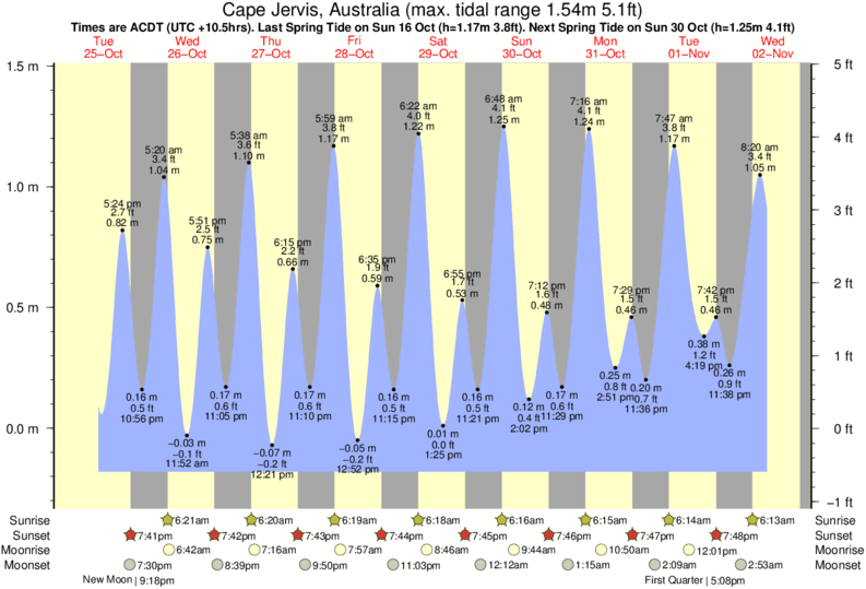 Tide Times are ACDT (UTC +10.5hrs). Last Spring High Tide at Cape Jervis was on Fri 19 Dec (height: 1.25m 4.1ft). Next high Spring Tide at Cape Jervis will be on Fri 02 Jan (height: 1.23m 4.0ft).
