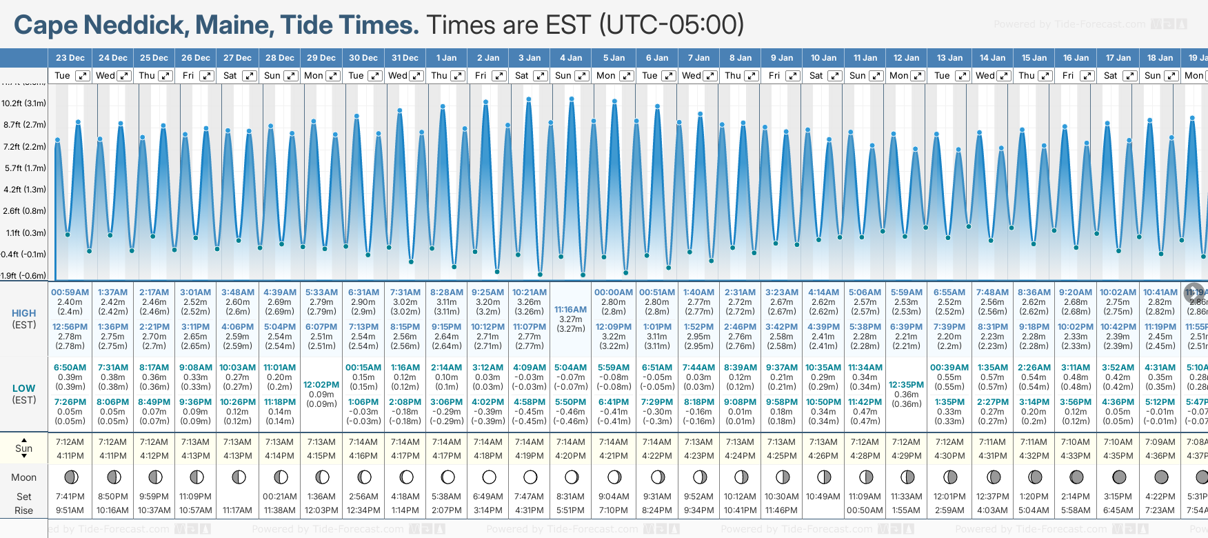 Tide Times are EST (UTC -5.0hrs). Last Spring High Tide at Cape Neddick was on Fri 05 Dec (height: 3.38m 11.1ft). Next high Spring Tide at Cape Neddick will be on Mon 22 Dec (height: 2.79m 9.2ft).
