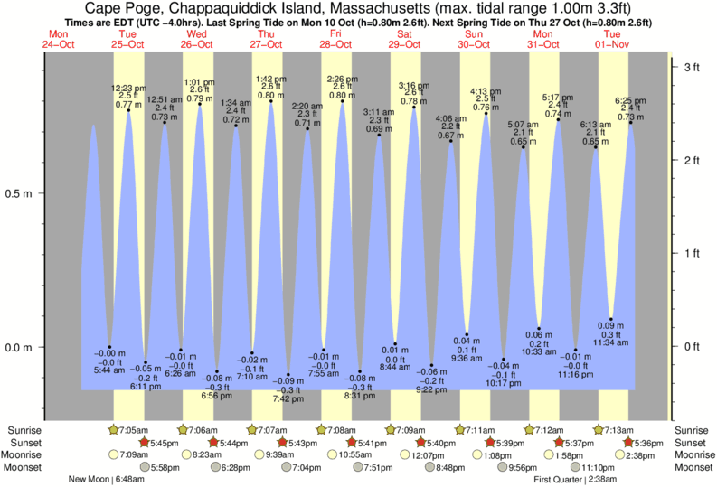 Tide chart for Cape Poge, Chappaquiddick IslandShowing low and high tide times for the next 30 days at Cape Poge, Chappaquiddick Island. Tide Times are EST (UTC -5.0hrs).