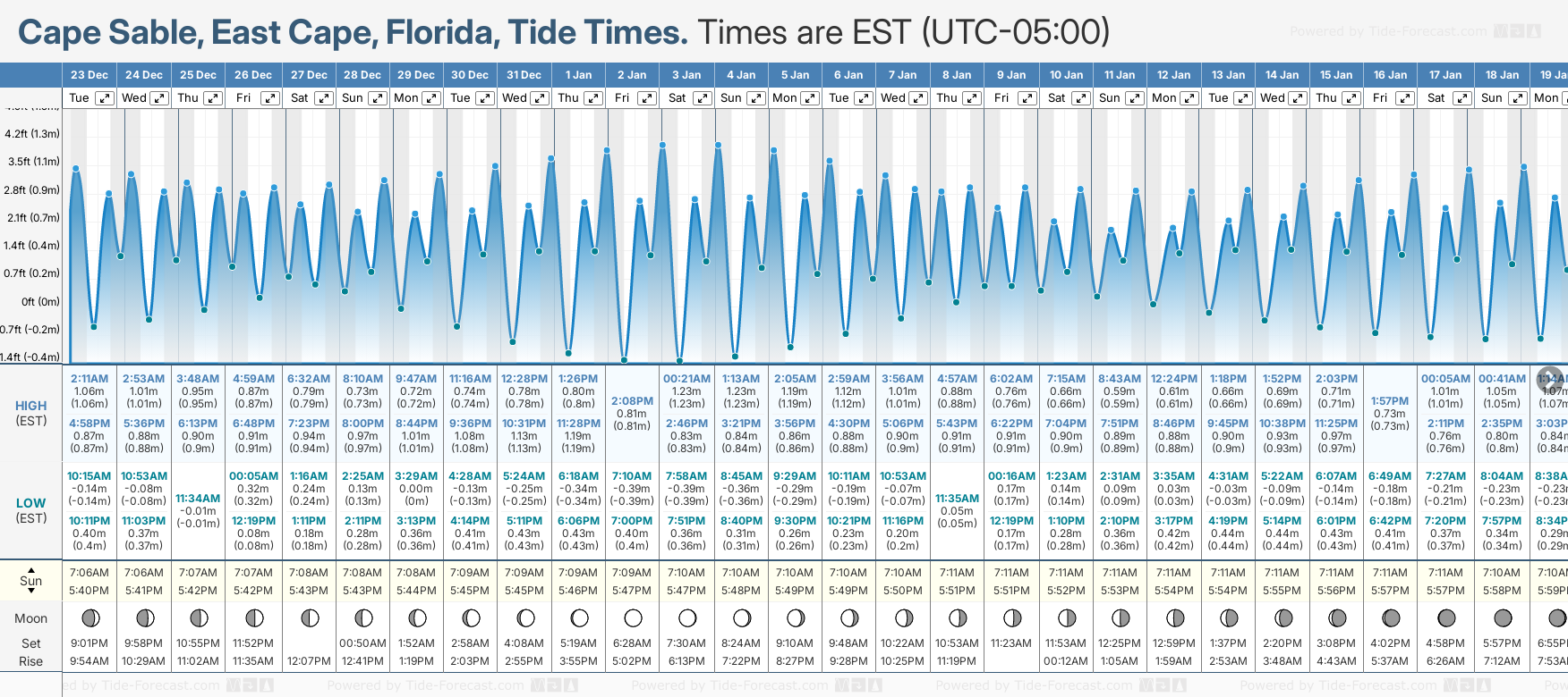 Cape Sable, East Cape tide times for December and January