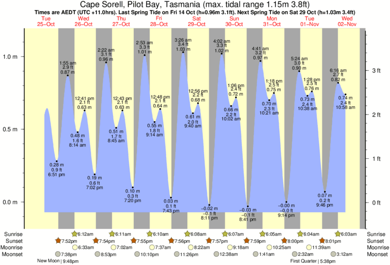 December and January Tide charts for Cape Sorell, Pilot Bay: The tide charts below show the height, time and date of high and low tides for the next 30 days.