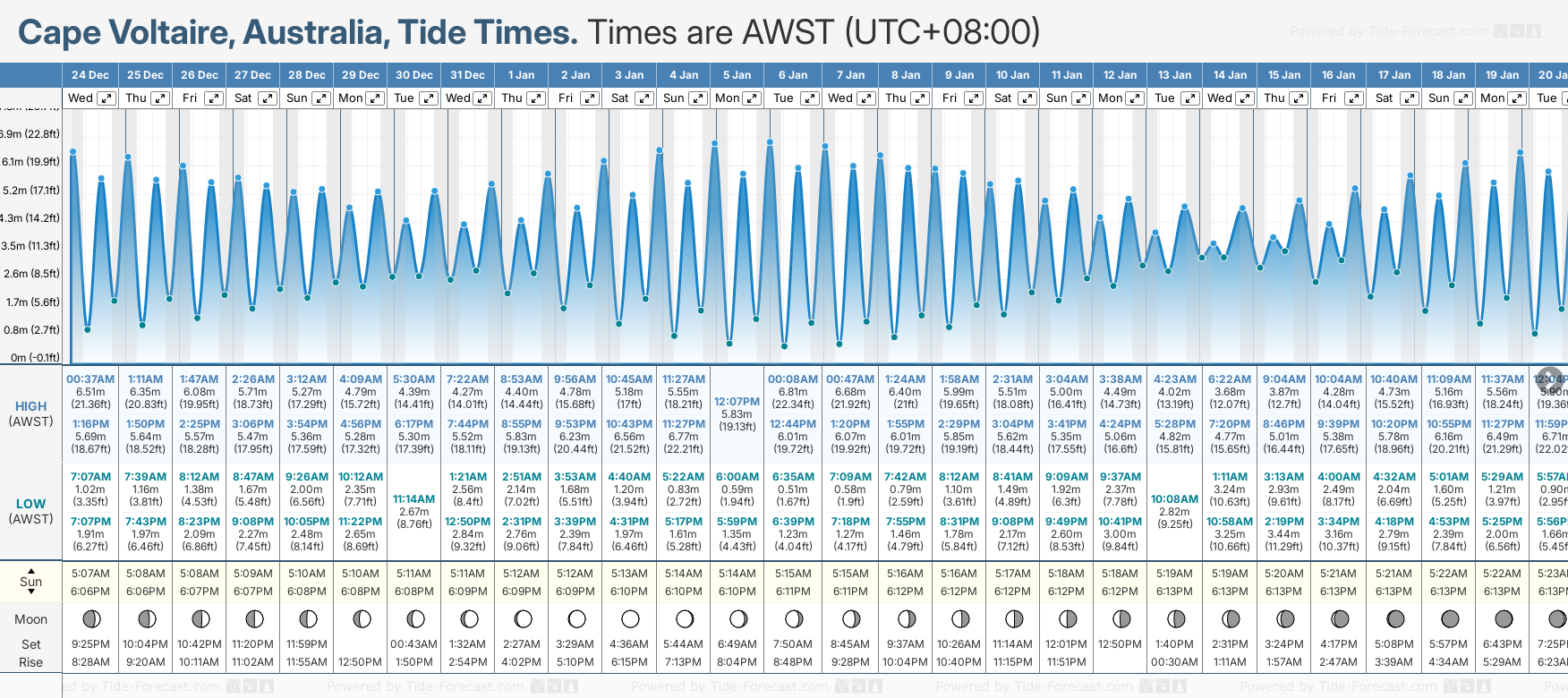Tide Times are AWST (UTC +8.0hrs). Last Spring High Tide at Cape Voltaire was on Tue 23 Dec (height: 6.57m 21.6ft). Next high Spring Tide at Cape Voltaire will be on Tue 06 Jan (height: 6.81m 22.3ft).