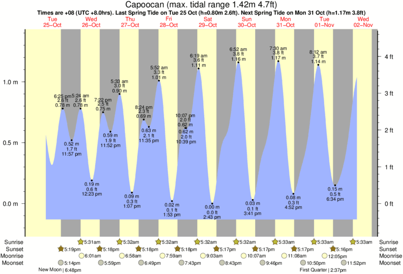 Tide Times are PST (UTC +8.0hrs). Last Spring High Tide at Capoocan was on Mon 08 Dec (height: 1.28m 4.2ft). Next high Spring Tide at Capoocan will be on Tue 23 Dec (height: 1.10m 3.6ft).