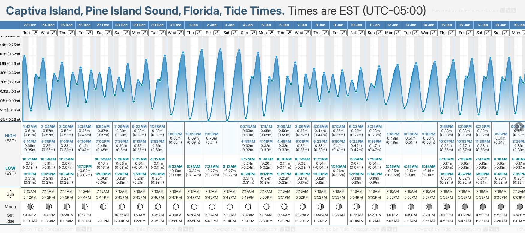 December and January Tide charts for Captiva Island, Pine Island Sound: The tide charts below show the height, time and date of high and low tides for the next 30 days.