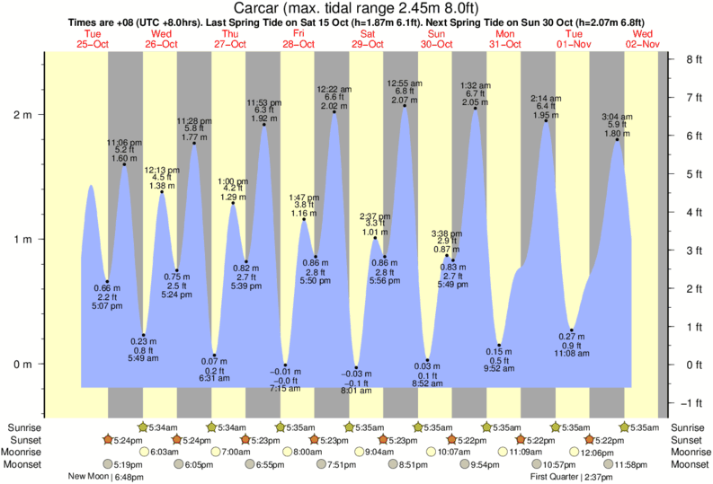 Tide Times are PST (UTC +8.0hrs). Last Spring High Tide at Carcar was on Sun 07 Dec (height: 2.23m 7.3ft). Next high Spring Tide at Carcar will be on Tue 23 Dec (height: 1.99m 6.5ft).