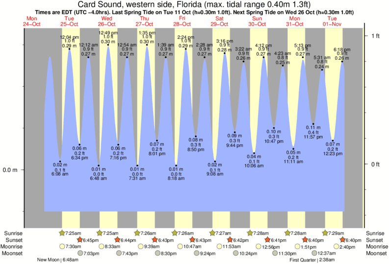 December and January Tide charts for Card Sound, western side: The tide charts below show the height, time and date of high and low tides for the next 30 days.