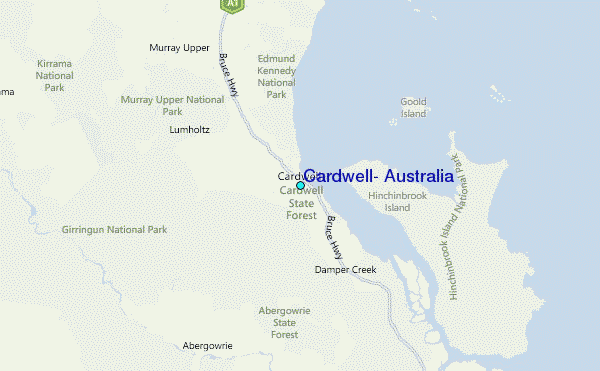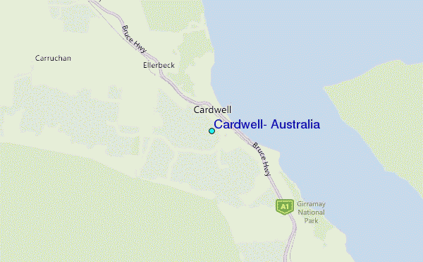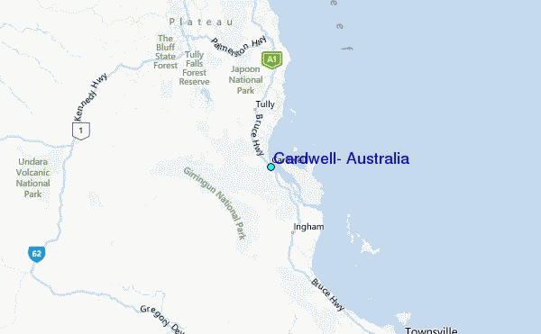 Use this relief map to navigate to tide stations, surf breaks and cities that are in the area of Cardwell, Australia.