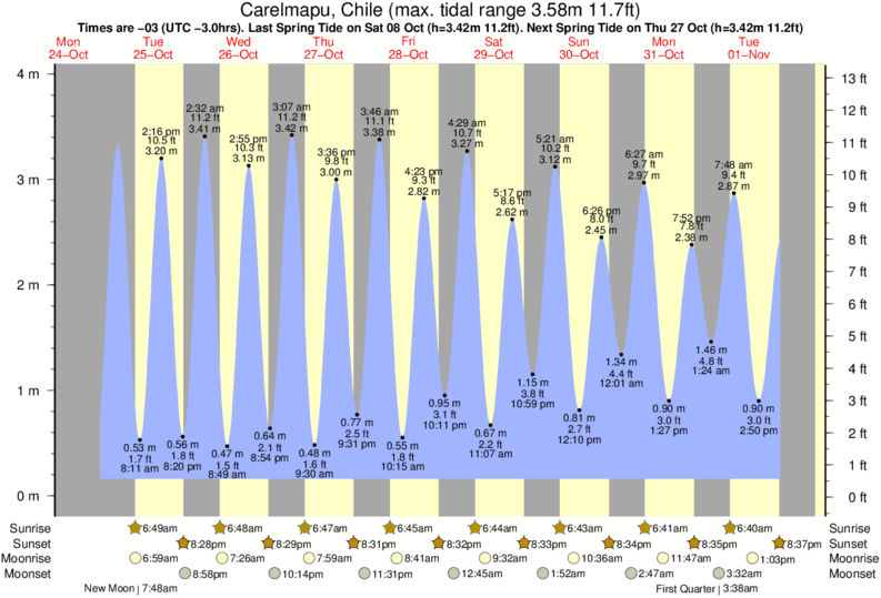 Tide Times are -04 (UTC -3.0hrs). Last Spring High Tide at Carelmapu was on Fri 05 Dec (height: 3.69m 12.1ft). Next high Spring Tide at Carelmapu will be on Sat 20 Dec (height: 3.26m 10.7ft).