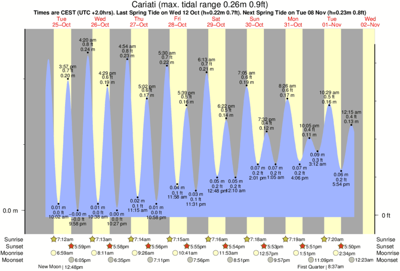 Tide Times are CET (UTC +1.0hrs). Last Spring High Tide at Cariati was on Sat 20 Dec (height: 0.22m 0.7ft). Next high Spring Tide at Cariati will be on Fri 02 Jan (height: 0.24m 0.8ft).