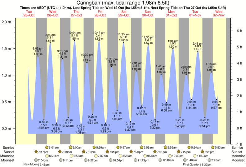 Tide chart for CaringbahShowing low and high tide times for the next 30 days at Caringbah. Tide Times are AEDT (UTC +11.0hrs).