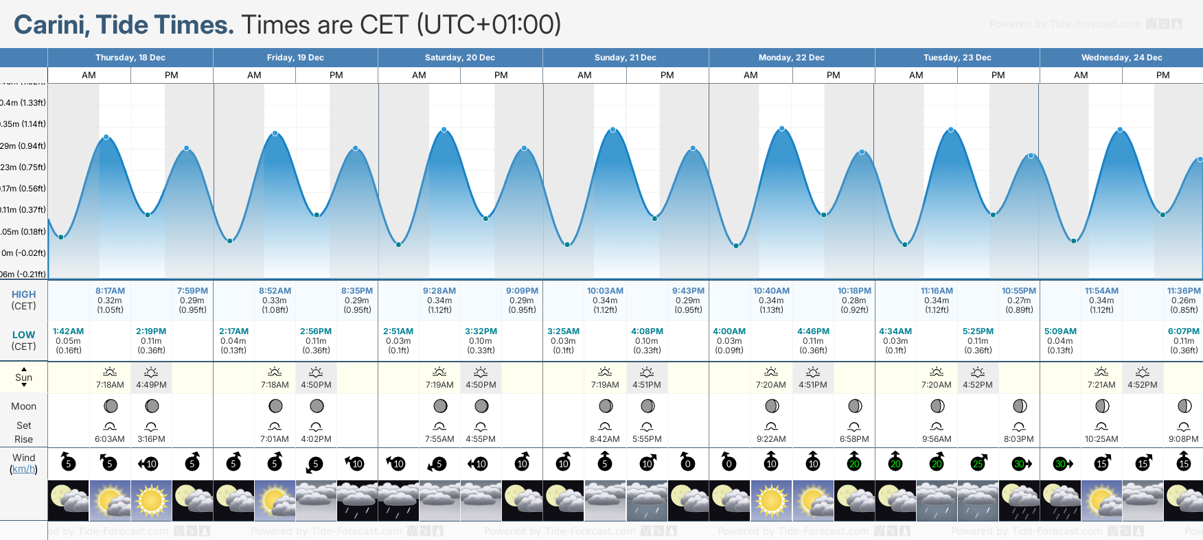 December and January Tide charts for Carini: The tide charts below show the height, time and date of high and low tides for the next 30 days.